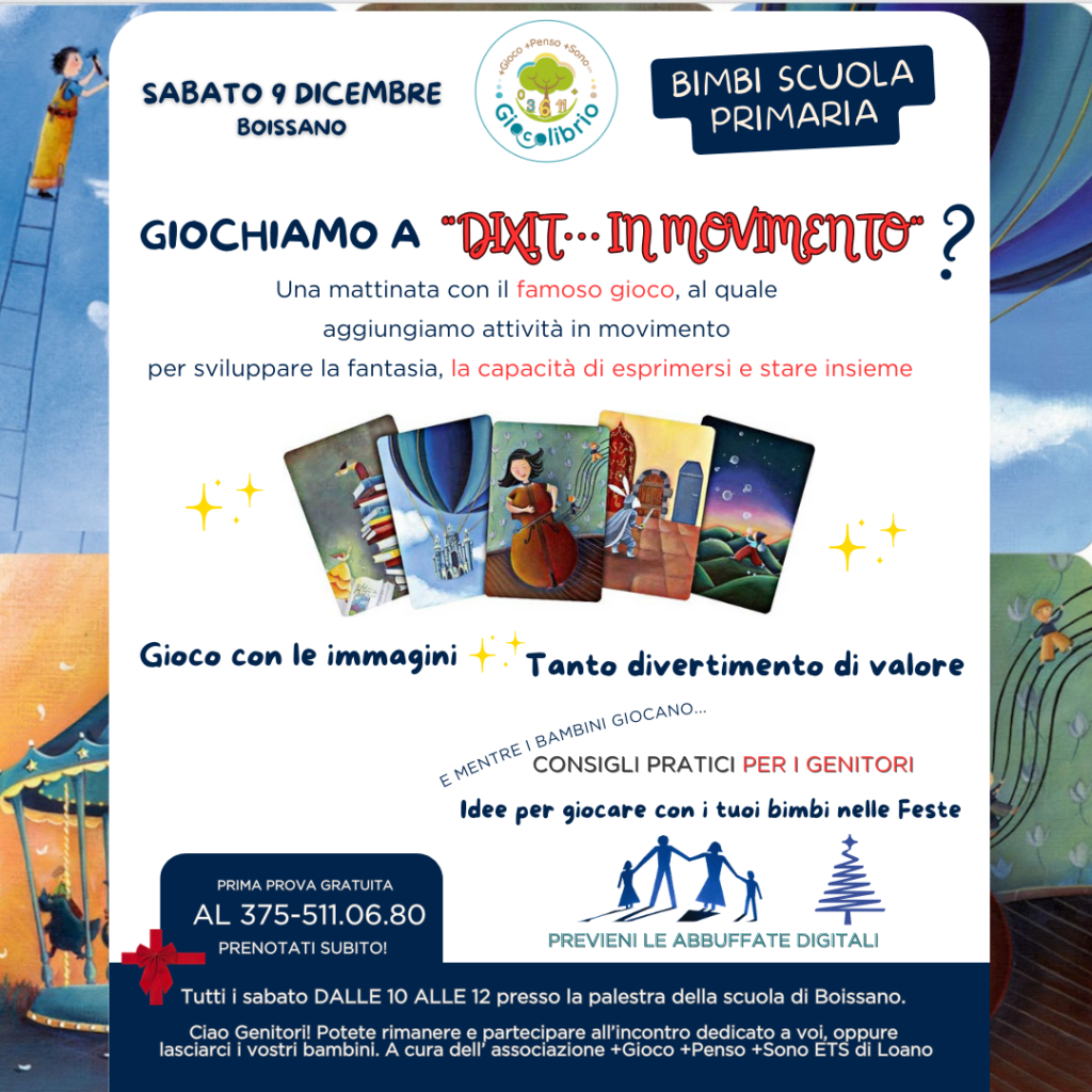 Sabato 9 Dicembre dalle 10 alle 12 presso la palestra della scuola di Boissano, a cura della nostra associazione, “+ Gioco + Penso + Sono” ETS.